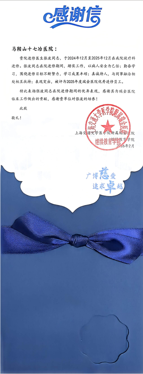 - 马鞍山十七冶医院肿瘤内科医生张波荣获瑞金医院优秀进修员工称号 2026-03-06