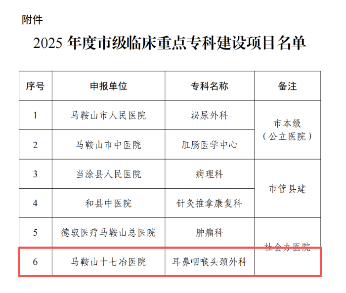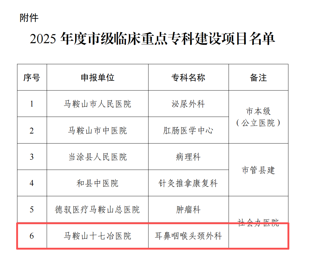 近日,马鞍山市卫生健康委员会与马鞍山市财政局联合下发《关于公布2025年度市级临床重点专科建设项目的通知》(马卫健〔2025〕50号),马鞍山十七冶医院耳鼻咽喉头颈外科经过严格申报、专家评审与综合审议,成功入选本年度市级临床重点专科。这一荣誉的获得,是市相关部门对我院该专科技术水平、学科建设与综合服务能力的权威肯定,标志着我院专科发展迈上了新的台阶。